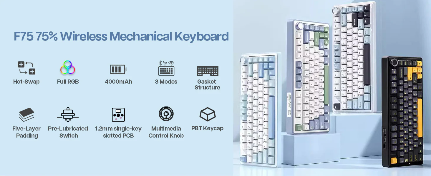 Discover exceptional performance and refined aesthetics with the Aula F75 Wireless Mechanical Keyboard in Thunder Black. Designed for gamers, coders, and professionals, this compact 75% keyboard combines tri-mode wireless connectivity, superior acoustics, and hot-swappable convenience — all enhanced with the smooth and silent Leobog Greywood V3 linear switches.