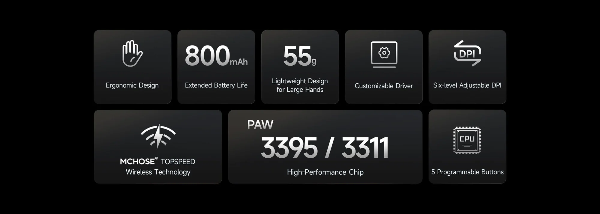 The 800mAh battery provides extended use without frequent charging. MCHOSE TOPSPEED wireless technology ensures fast, stable, and lag-free connection.