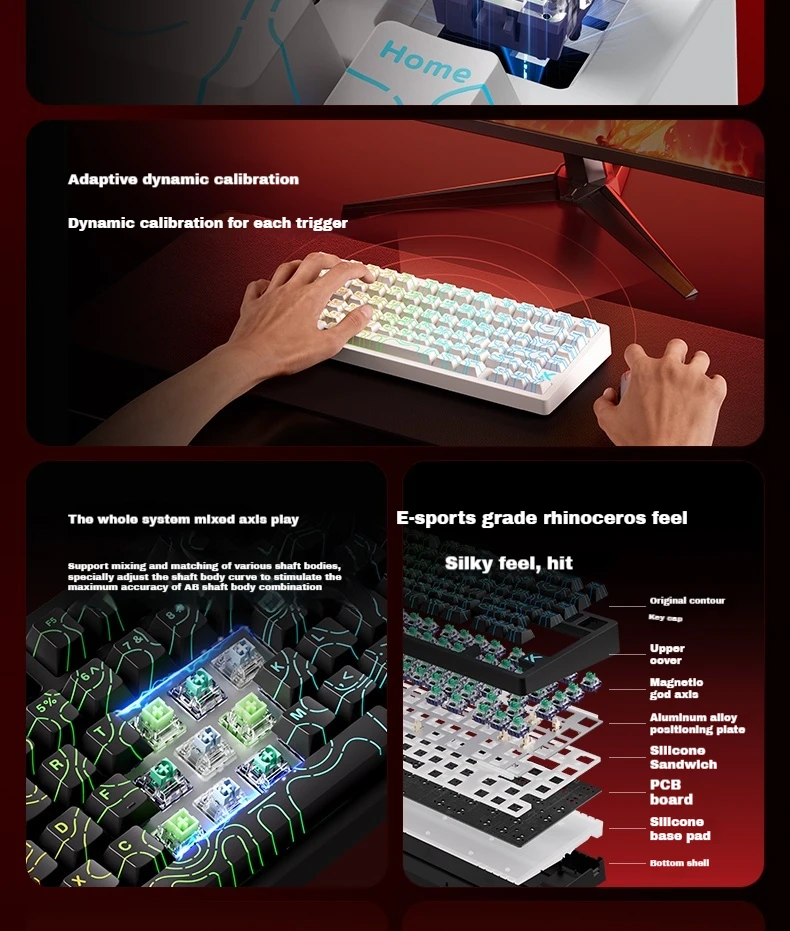 With adjustable actuation points ranging from 0.1–3.4mm, you gain full control over keystroke sensitivity. Rapid Trigger Technology ensures faster resets and fluid actions by dynamically activating and deactivating keys, while Adaptive Dynamic Calibration optimizes accuracy in real-time without manual tuning.
