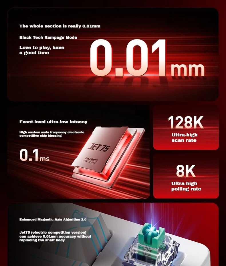 The Jet 75 delivers true 0.005mm keystroke accuracy, 0.1ms ultra-low latency, and an 8KHz polling rate for lightning-fast responsiveness. Every input is captured instantly, giving you the competitive edge needed in fast-paced FPS titles and esports arenas.