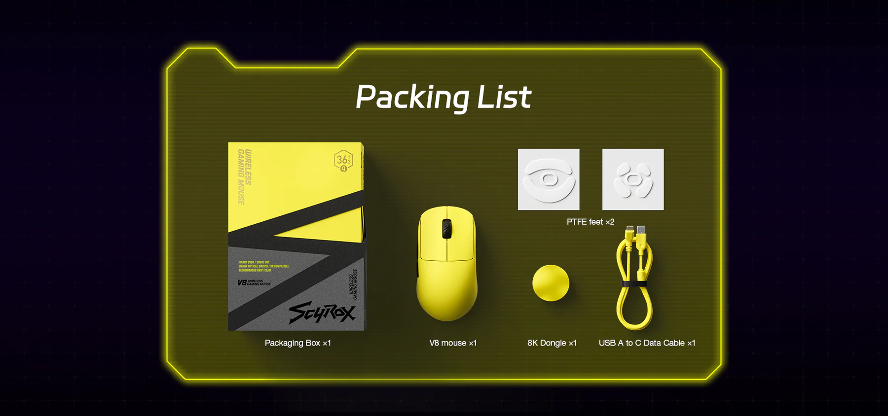 With dual-mode connectivity (2.4GHz wireless and USB-C wired), this mouse is powered by the Nordic 52840 chipset for stable, low-latency wireless performance. The package includes a high-speed 8K dongle, USB-C cable, and extra PTFE feet for smooth glide.