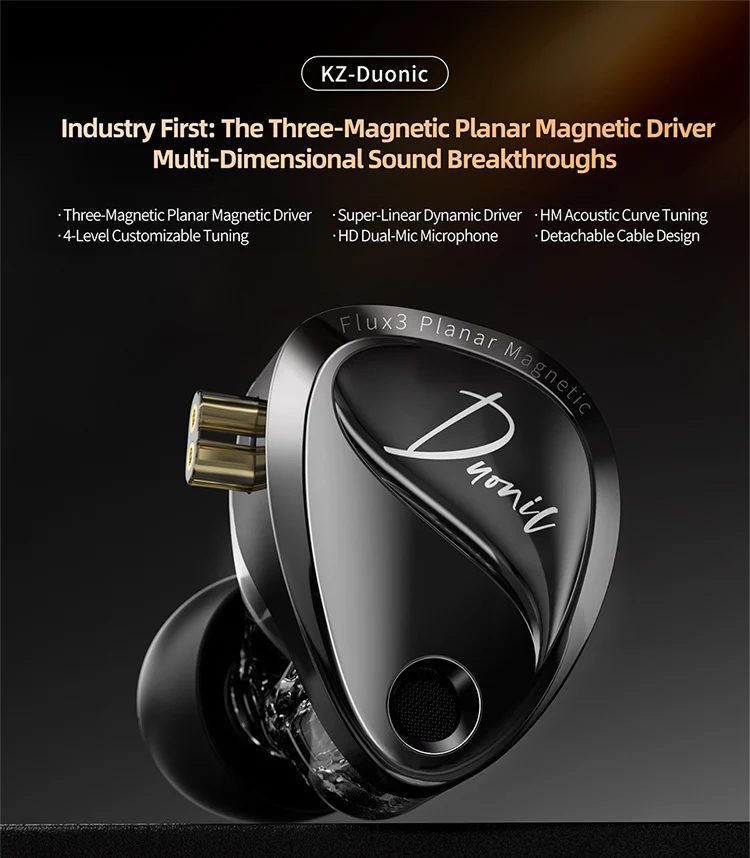 Upgrade your gaming and music experience with the KZ Duonic USB Type-C DAC version, featuring the industry-first three-magnetic planar magnetic driver and a hybrid dual-driver design. Designed for gamers, audiophiles, and content creators, the KZ Duonic delivers high-resolution sound, precise positional audio, and low latency, all in a lightweight and comfortable in-ear monitor.