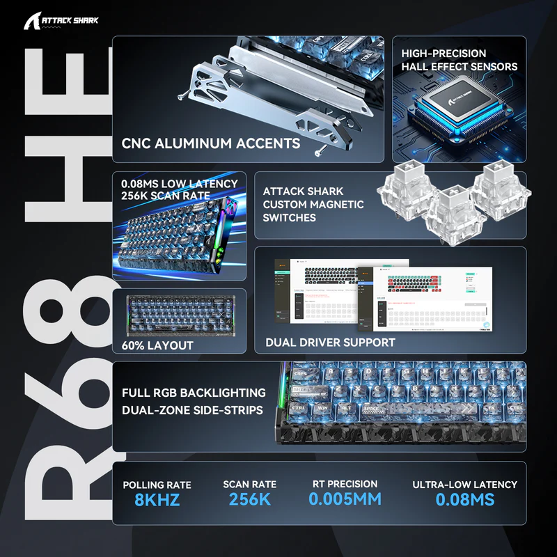 The ATTACK SHARK R68 HE Magnetic Gaming Keyboard delivers 0.005mm Rapid Trigger precision, 8,000Hz polling rate, and a compact 60% layout built for FPS, esports, and competitive gaming. Designed with Hall Effect magnetic switches and a carbon fiber chassis, it offers elite speed, accuracy, and durability.