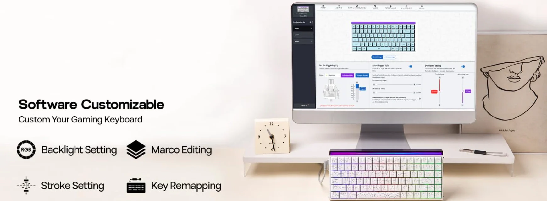 The Hero84 HE supports programmable key mapping, macros, hotkeys, and lighting control through its web driver. Dynamic keystroke and Mod Tap functions allow multiple commands per key, ideal for both gaming and productivity workflows.