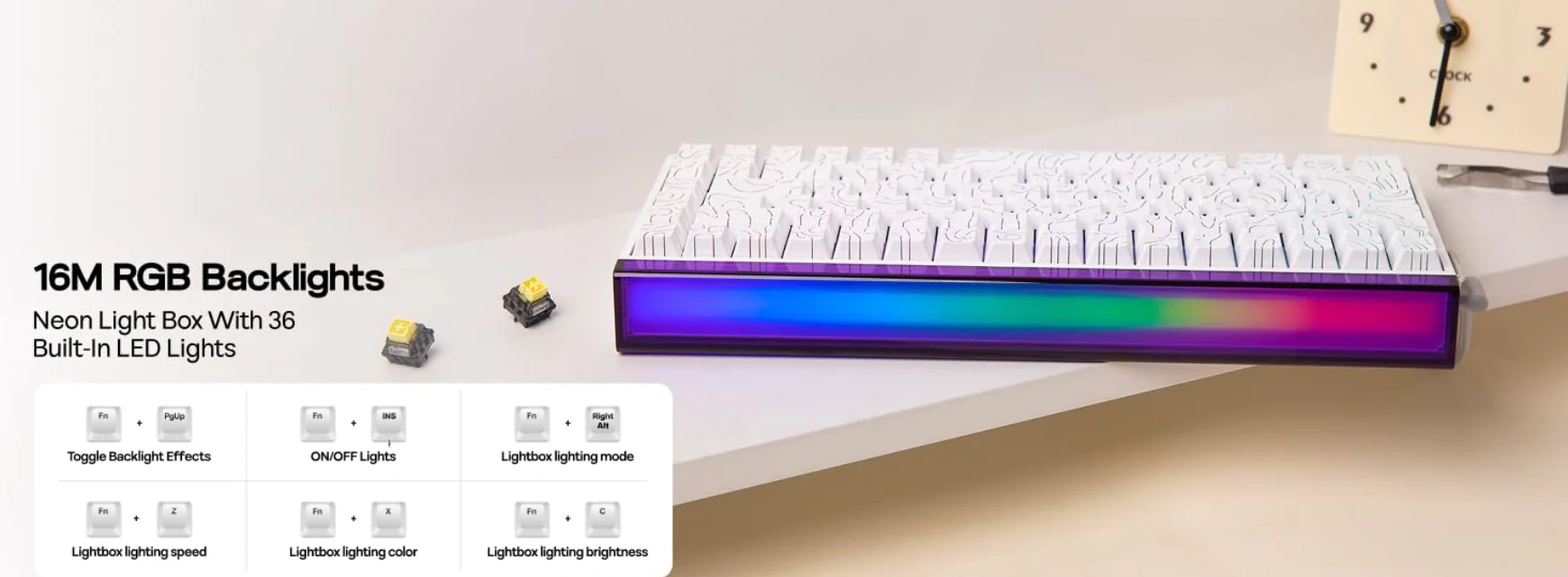 Equipped with south-facing per-key LEDs, the Hero84 HE offers full RGB customization via the web driver. Adjust key mappings, macros, lighting patterns, actuation points, and effects from any Chromium-based browser. The lightbox design enhances visibility and creates an immersive gaming atmosphere.