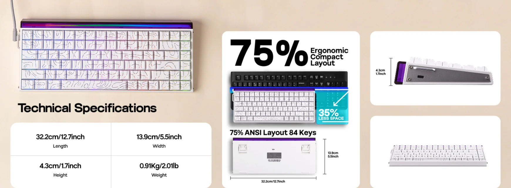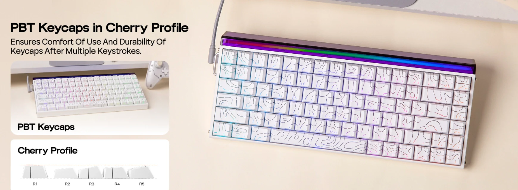 The Hero84 HE features 84 keys in a 75% layout, helping maintain a clutter-free desk. Its tray-mount ABS plastic case is complemented by a metal volume knob and gasket-mounted design, ensuring a stable, thocky typing feel. Multi-layer sound dampening reduces noise for a satisfying experience. The keyboard measures 322.05 × 138.95 × 42.51 mm and weighs 0.91kg.