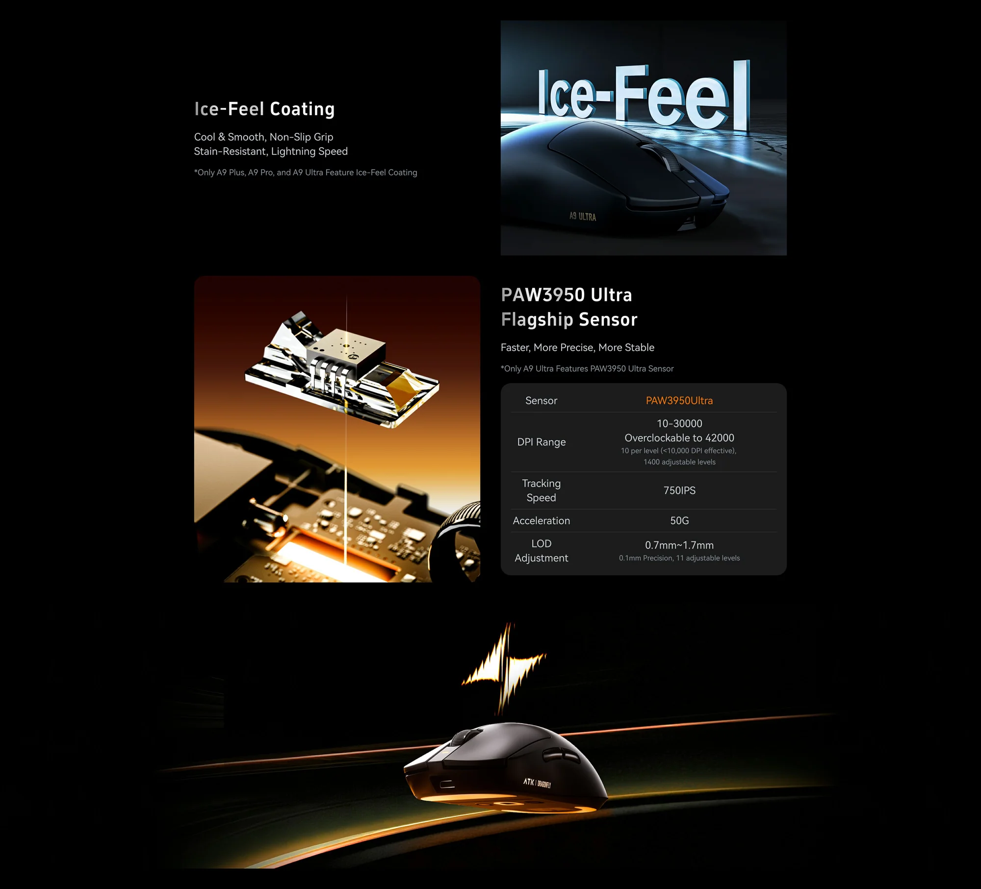 Weighing as light as 53g while maintaining structural integrity, the ATK Dragonfly A9 Pro is designed to be lighter than comparable products on the market. This weight reduction helps minimize hand fatigue, enhance maneuverability, and enable quicker reactions in FPS, MOBA, and RTS games.