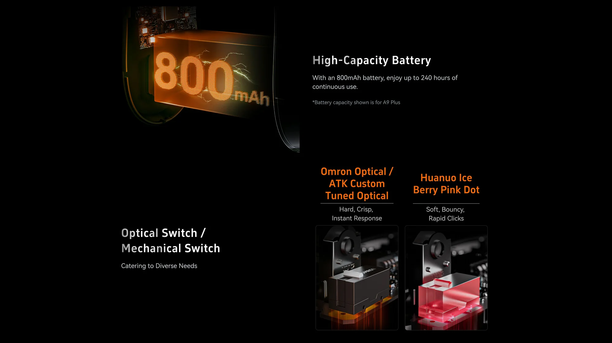 The ATK Dragonfly A9 Plus features high-quality Optical switches to meet different gaming preferences, delivering consistent feedback, fast response, and long-lasting durability for intense gaming sessions.